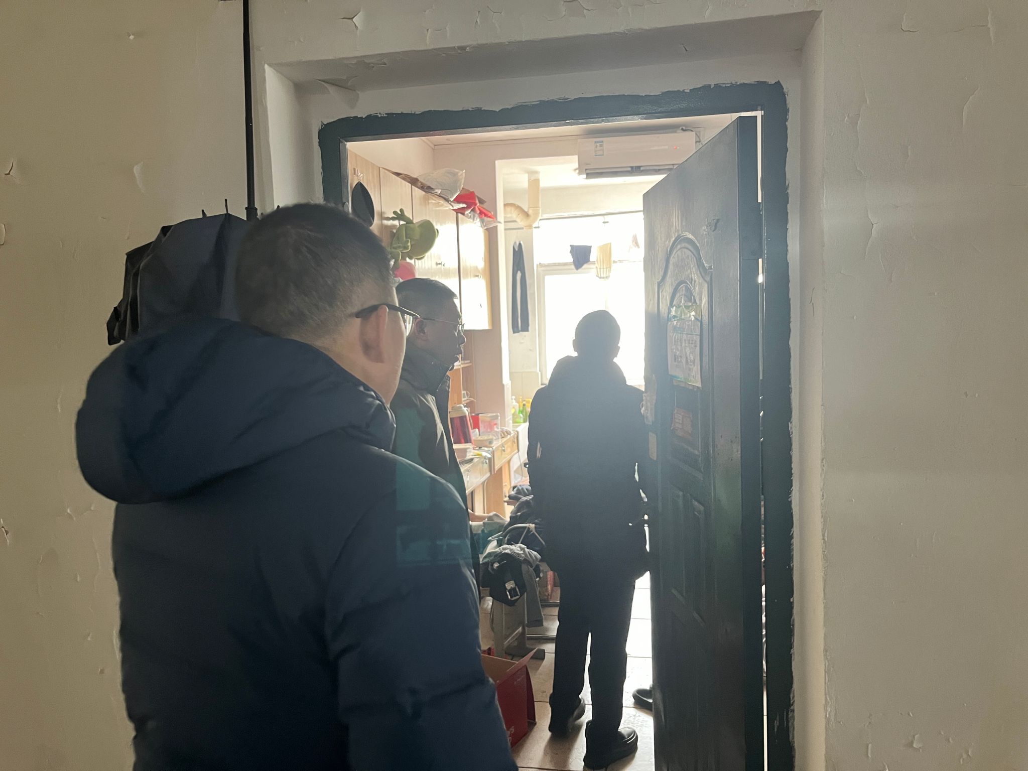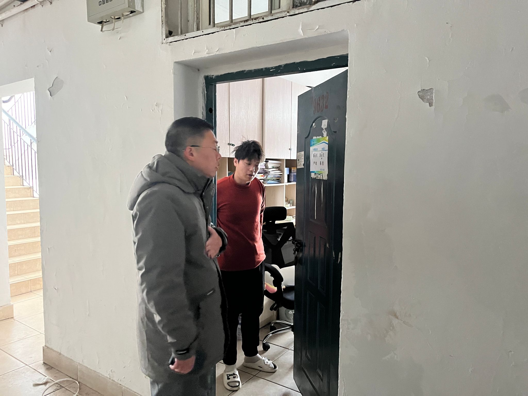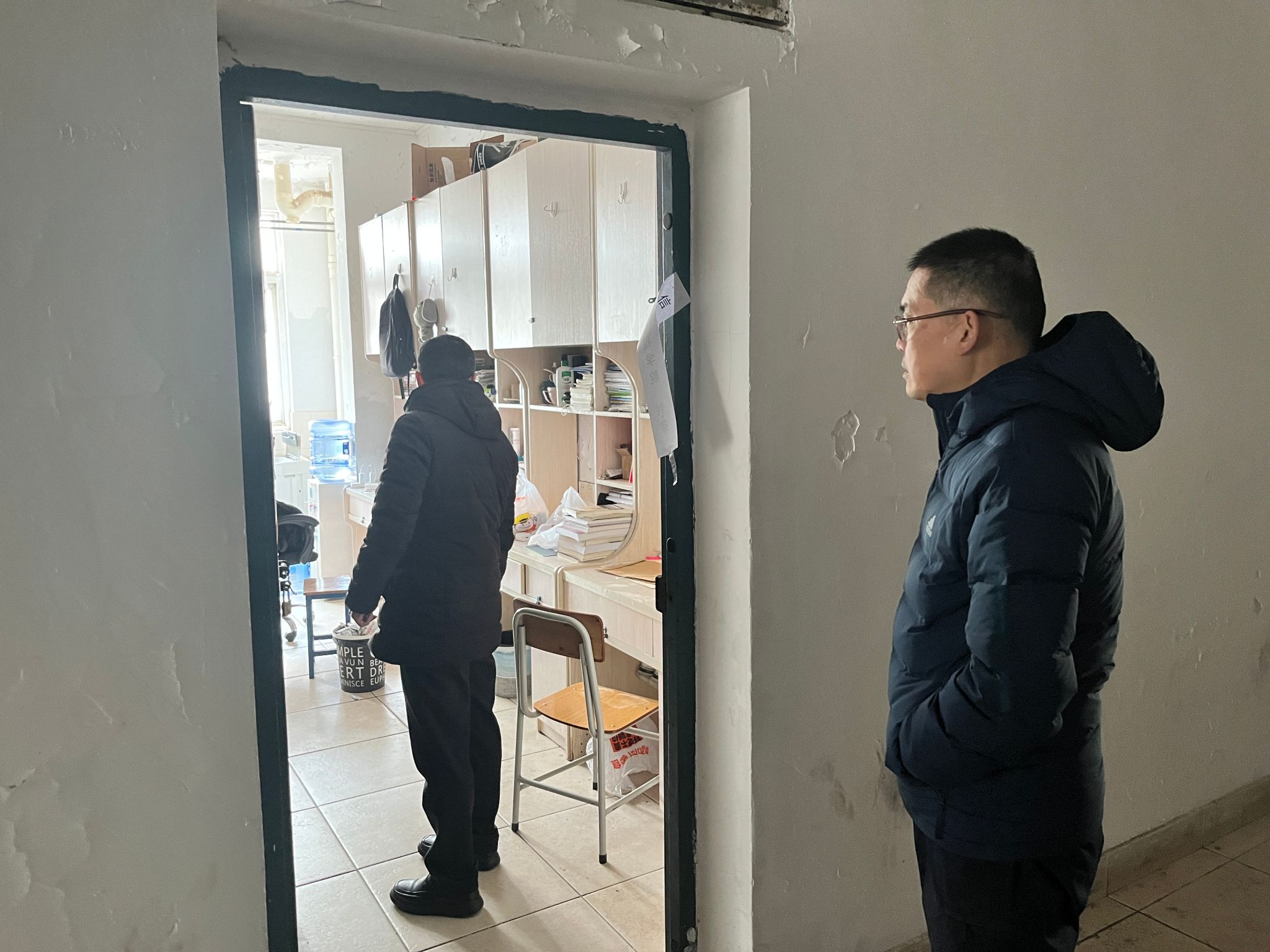 随后,一行人前往学生宿舍,了解暂未离校学生近况,并且叮嘱日常用电安全,之后还逐间检查了学生宿舍的封条情况、宿舍楼的消防设施以及楼道通道的畅通情况。
