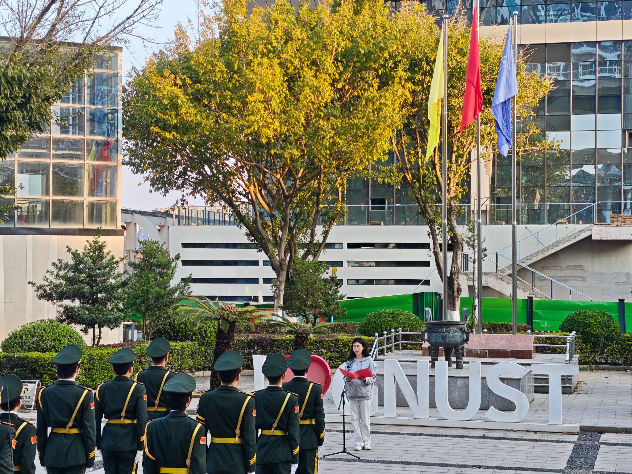 早晨7点30分,学校国旗护卫队的旗手们迈着矫健的步伐,护送着鲜艳的五星红旗入场。伴随着《义勇军进行曲》的响起,五星红旗冉冉升起,全体行注目礼、奏唱国歌,现场氛围庄严肃穆。