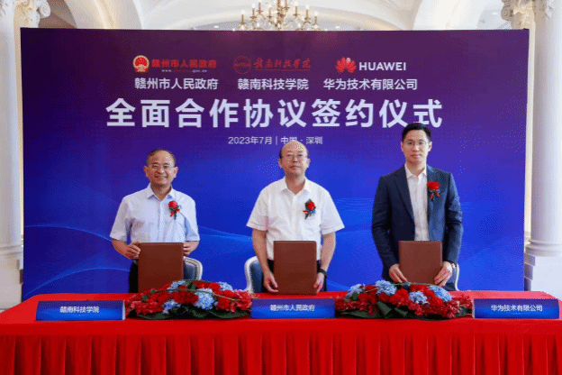 赖正文副市长代表赣州市人民政府在会上讲话。他说,赣州是党中央和习近平总书记特别关心的地方,政治生态好、自然环境好、高校资源密集、头部企业非常看好;这次政校企合作共建电子信息产业学院和数字经济领域公共实训基地意义重大,是落实国家战略部署的重要举措、是华为支持赣南等原中央苏区振兴发展担当作为的重要体现、是共同推动数字经济发展的重大课题;他表示,赣州市人民政府会全力支持三方合作,希望三方聚集资源优势,以“政府推动、市场认可、互惠互利、合作共赢”为基本原则,以数字经济领域作为合作重点,逐步深入开展全方位合作,细化建设方案,紧密对接,加速落地,高质量推进,打造行业一流、全国典范的合作样板。