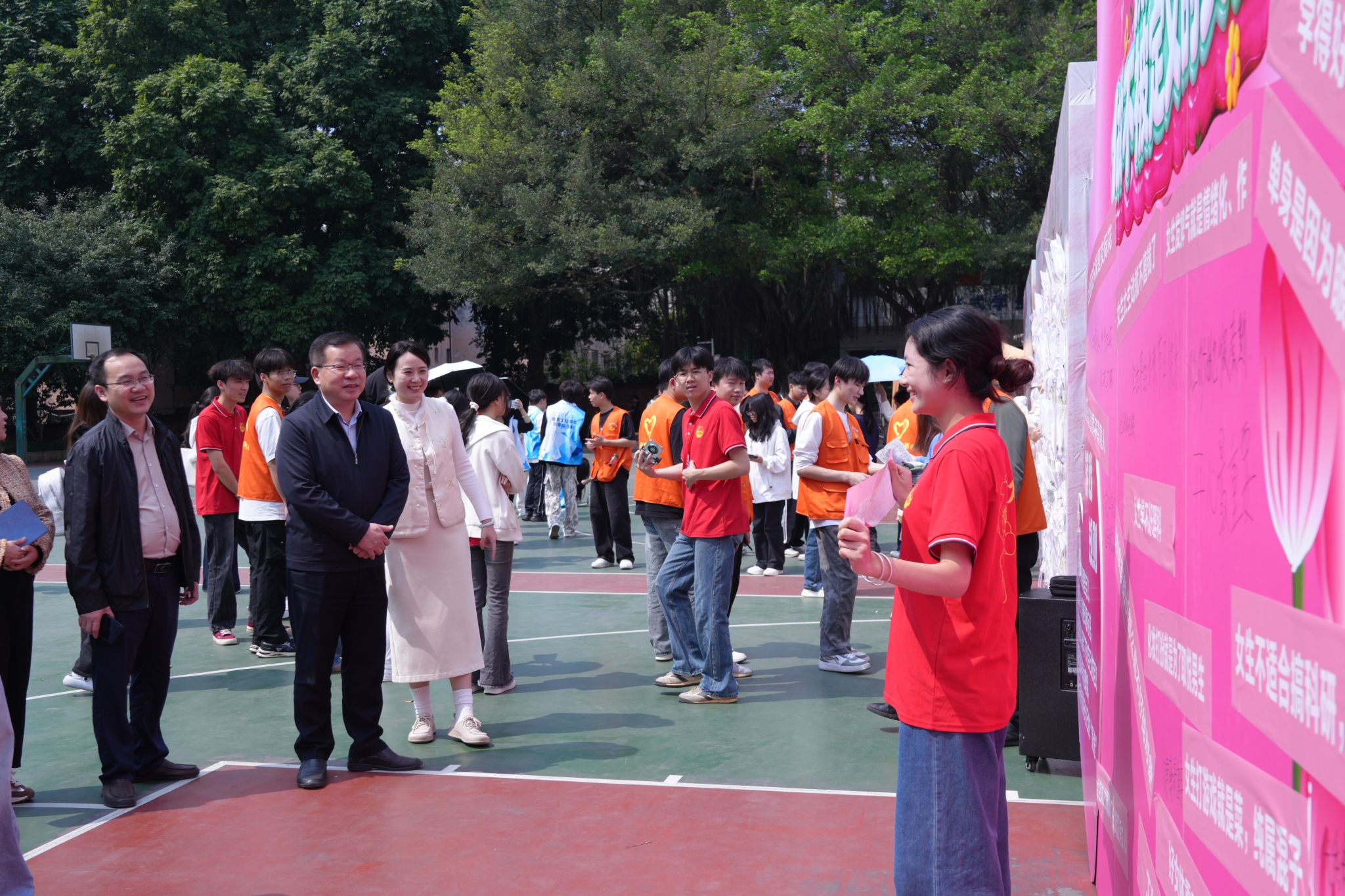 当天下午,学校党委书记李林、副校长黄海滨来到活动现场,与师生共同参与节日活动,并向全校女教职工和女大学生致以诚挚问候。在“凝聚她力量”校园迷你倡议活动现场,领导们驻足观看“撕下标签,做不被定义的女性”互动展板。李林指出,女大学生们应勇敢打破外界定义,坚定“自尊、自信、自立、自强”信念,在民族复兴征程中绽放青春芳华。